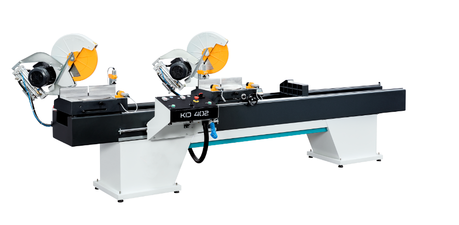 - Semi-automatic miter saw with two circular saws designed for flat or angled cutting of vinyl, aluminum, and wood frames.